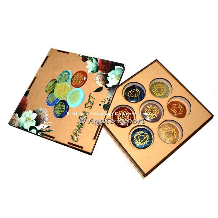 Agate Export offers 7 Chakra Engraved Disc Set with Colour Printed Box. All stones are highly polished gemstone in Cube shape embossed with a chakra symbol which represents a specific energy. These seven stones indicate an alignment with the seven chakras of the body. Buy this chakra set as per your customization for logo and design.