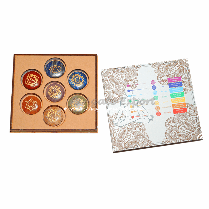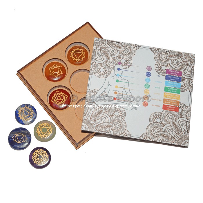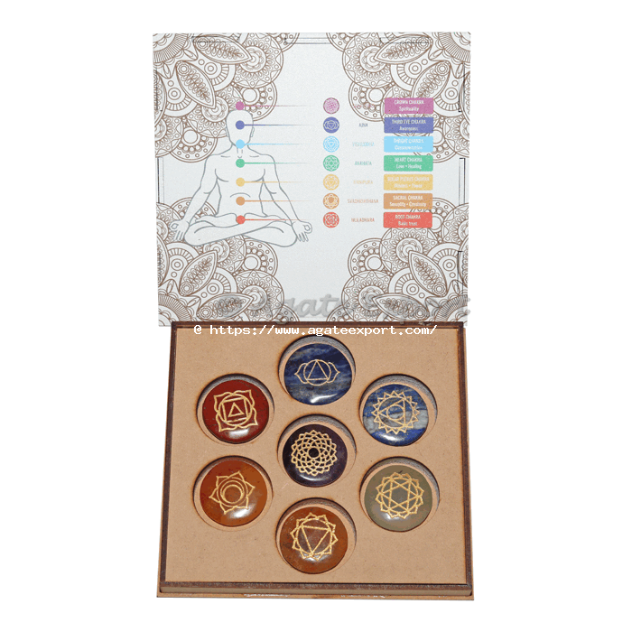 Order online for Engraved Seven Chakra Set with Buddha Mandala Printed Box to hold all your stones. This set of seven colored agate stones lets you meditate on whatever Chakra you feel needs work. Stones are packaged in an exquisitely designed gift box and come with a Buddha Groove satin pouch for safekeeping. For any special order contact us directly. You can use as Pocket Stones, Worry Stones, Meditation, or for crystal healing and Reiki. Place your order online. Buy this chakra set as per your customization for logo and design.